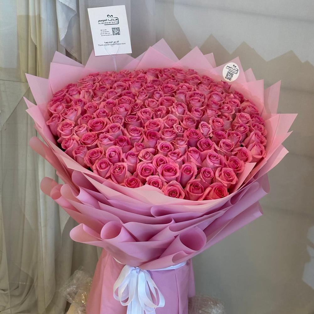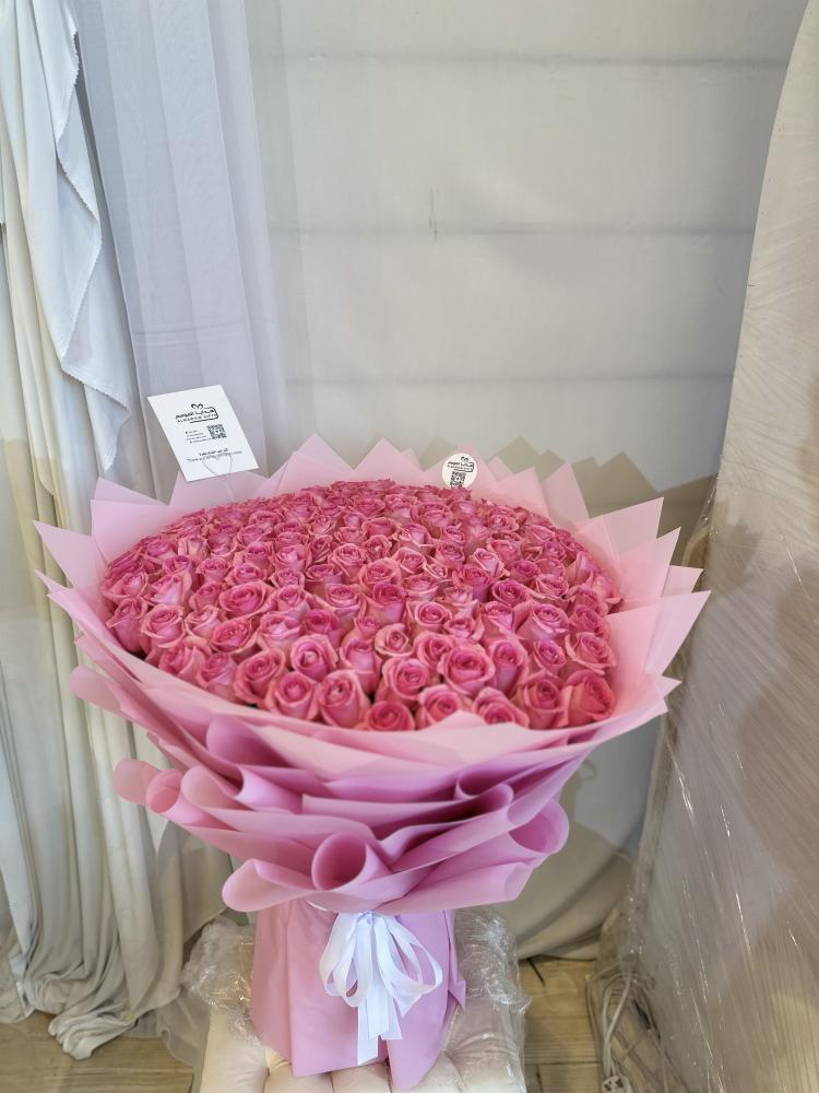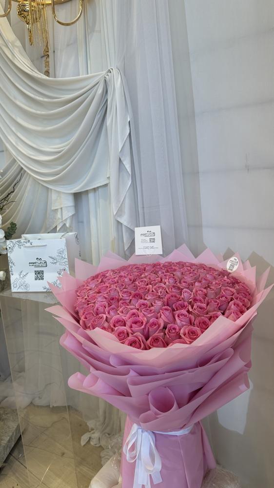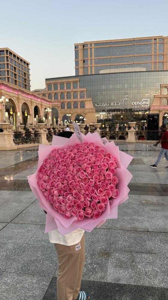 تأسر القلوب بألوانها الوردية الساحرة، وتعبّر عن الرقي والحب في كل مناسبة. باقة ضخمة مكونة من 130 وردة طبيعية منتقاة بعناية، تغلفها أوراق أنيقة بدرجات الوردي وتُزين بشريطة بيضاء فاخرة. إنها ليست مجرد ورد… إنها رسالة فخمة بلغة الزهور
