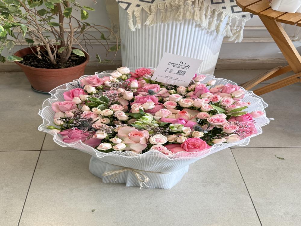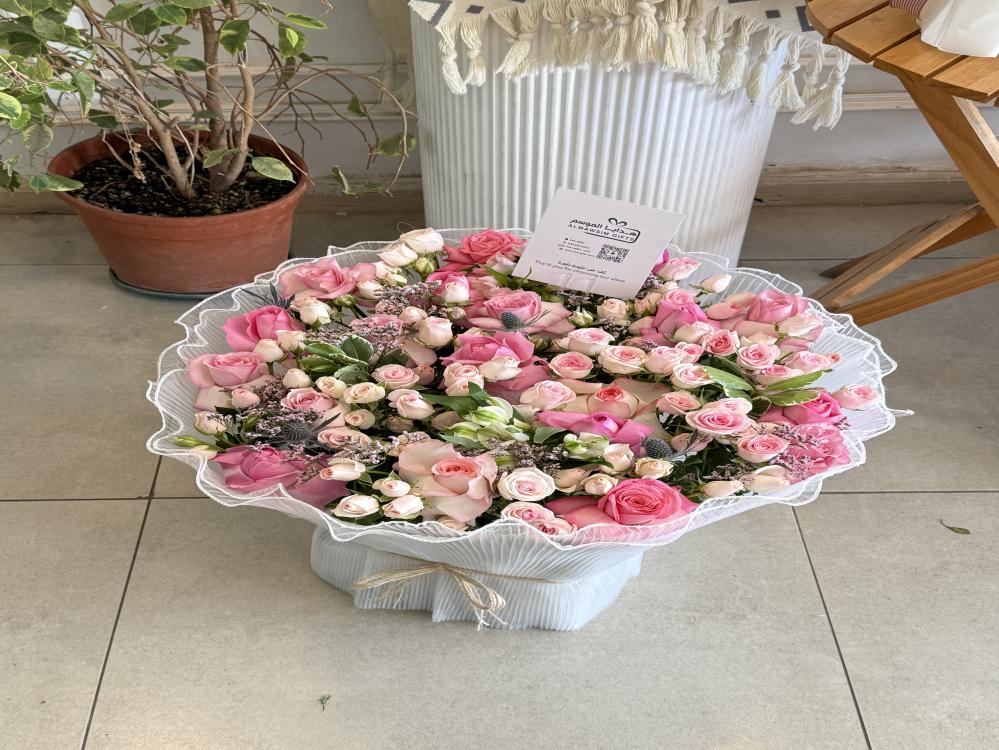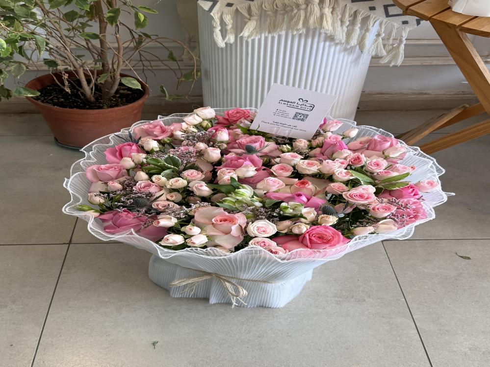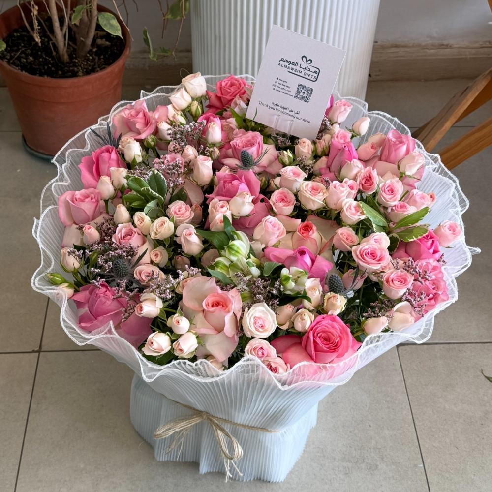 قة فاخرة ومتميزة من تنسيق الورود الطبيعية المتنوعة، بتدرجات الوردي الناعم والأنيق. تجمع بين الجمال والرقي وتُقدّم في تغليف فاخر جداً يليق بالمناسبات الخاصة مثل عيد الميلاد، التخرج، الزفاف، أو حتى للتعبير عن الامتنان والحب.