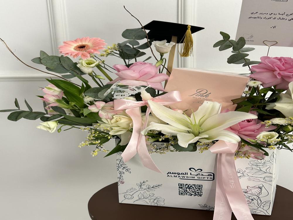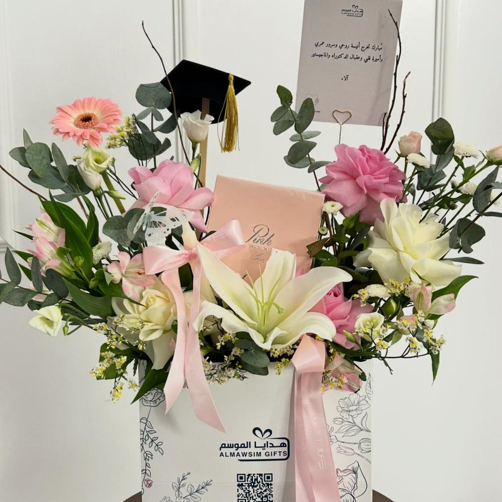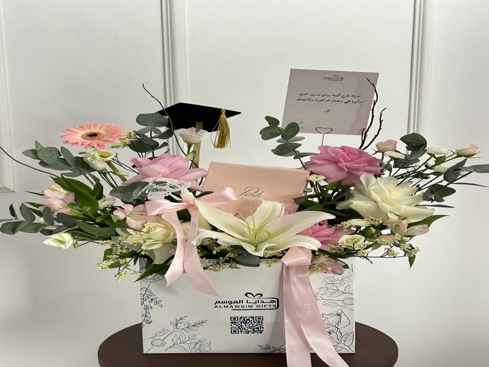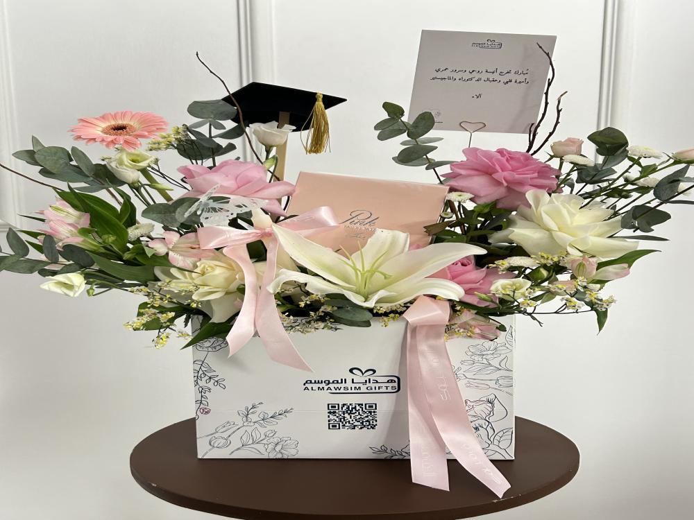 بوكس ورد أنيق مقدم من “هدايا الموسم”، بتنسيق فاخر من الزهور الطبيعية المنسقة يدوياً، يضم توليفة من الزهور الوردية والبيضاء والكرت الجميل ورسالة تهنئة، مع لمسة رمزية مميزة على شكل قبعة تخرج 🎓.