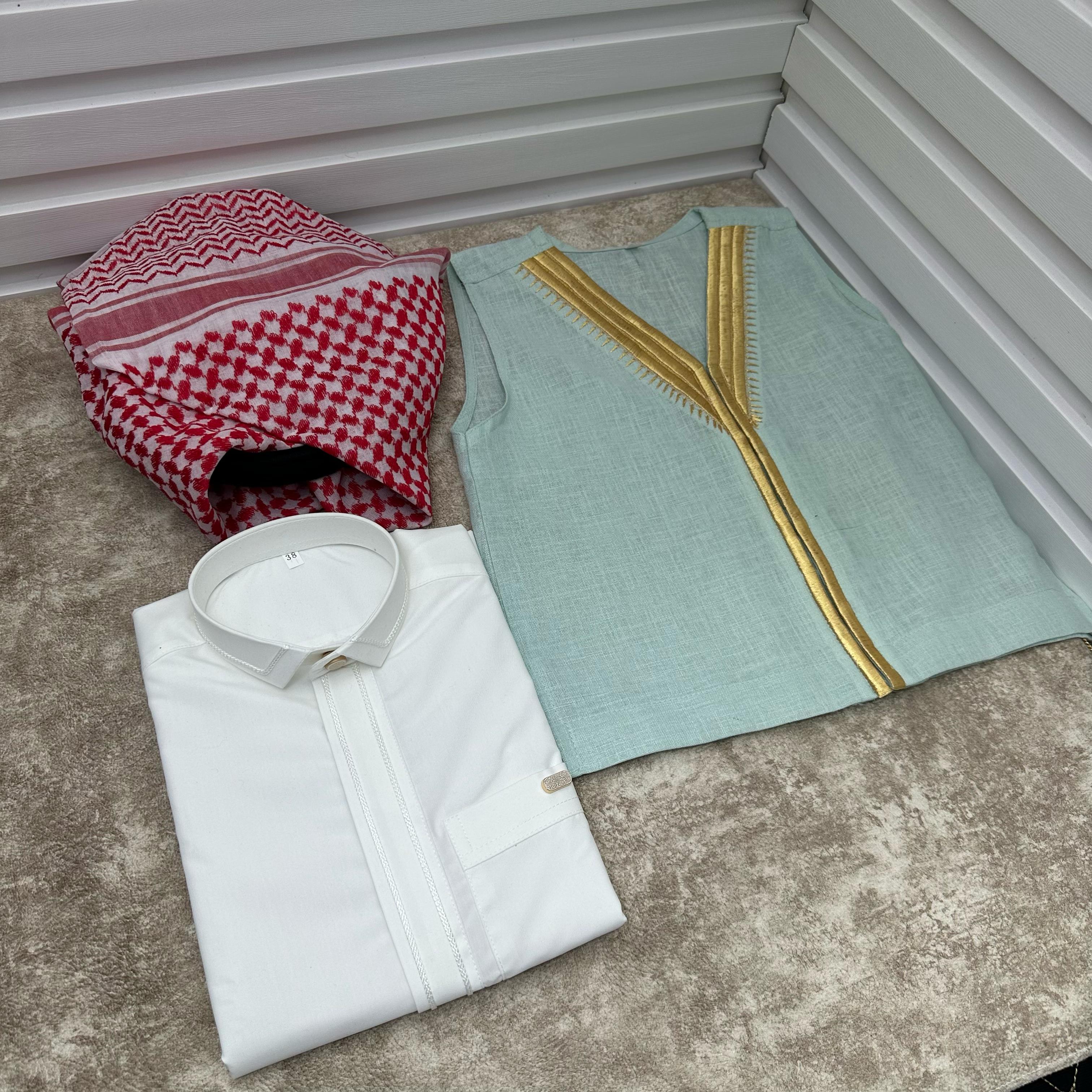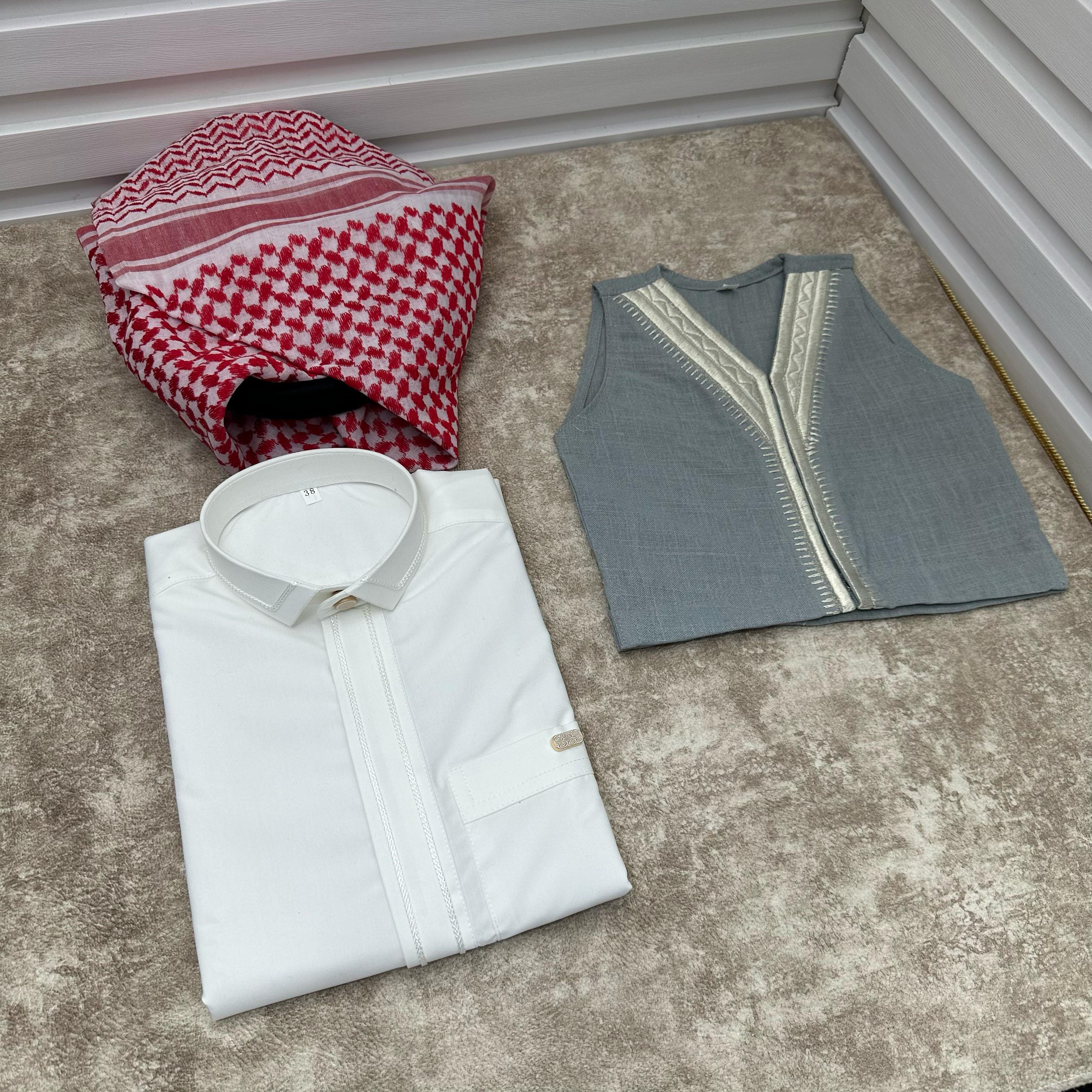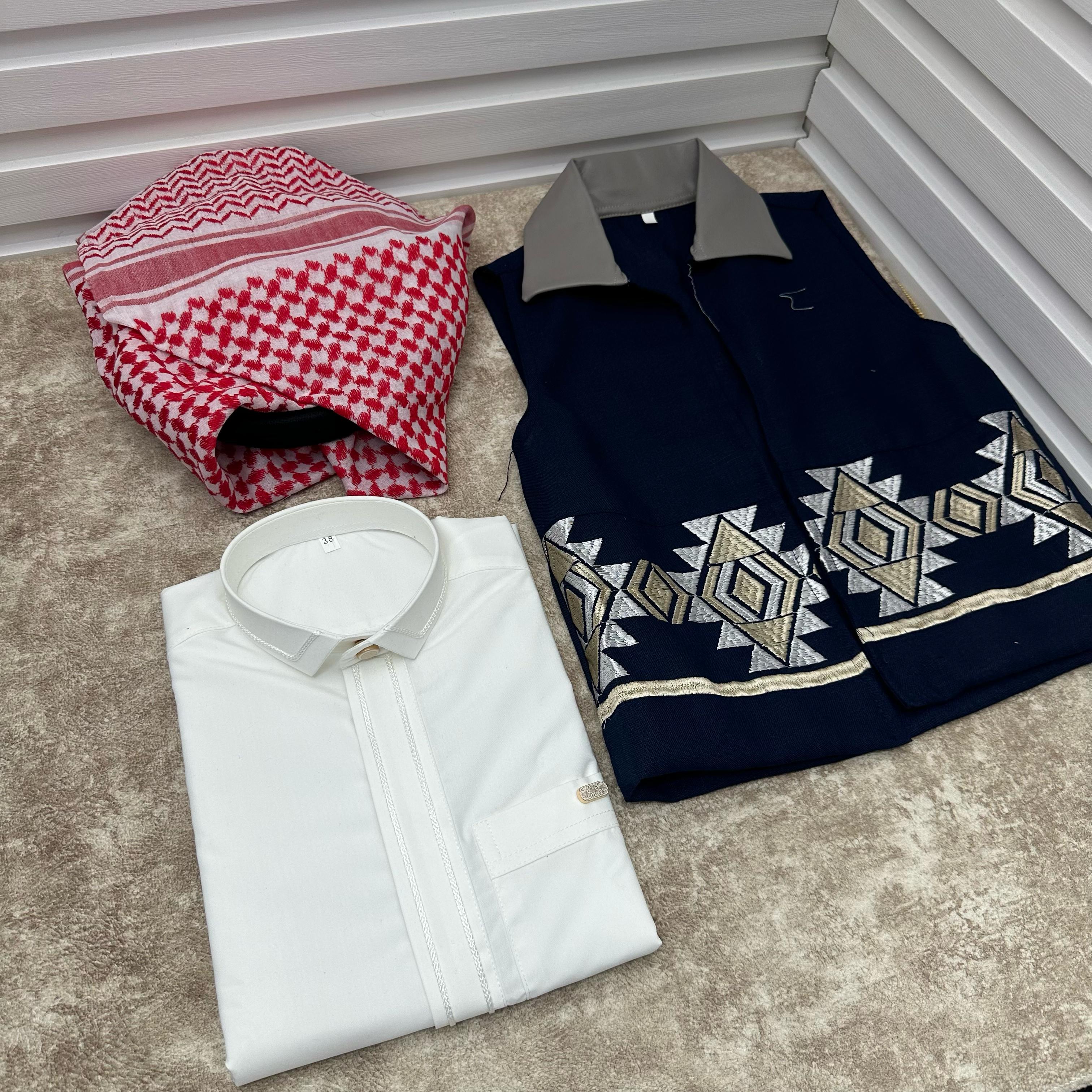 * إطلالة متكاملة: يتكون من سديري مطرز، ثوب أبيض ناصع، وشماغ أحمر كلاسيكي، كل ما يحتاجه طفلك لإطلالة ساحرة.