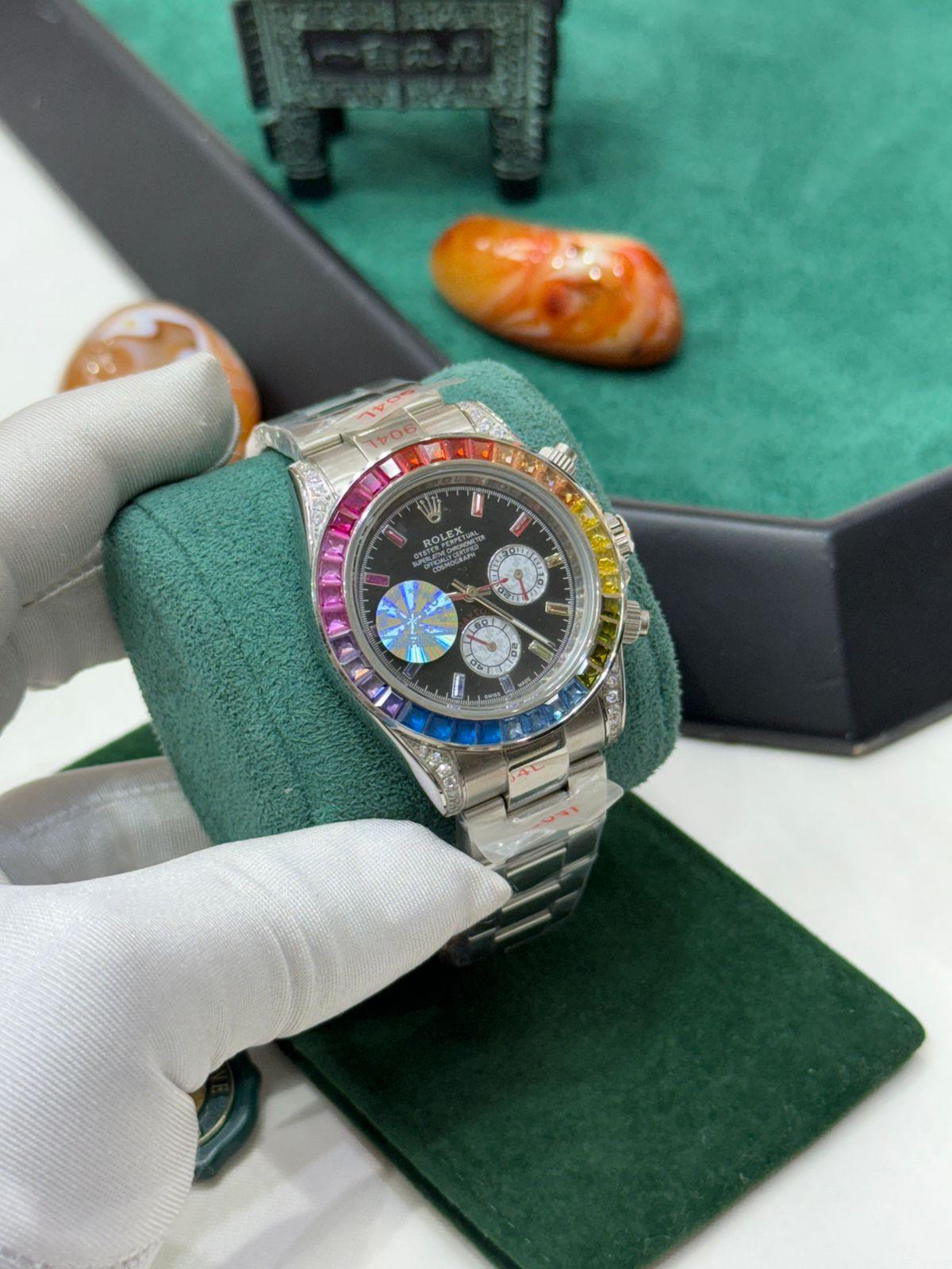 هذه الساعة الفاخرة بإطارها الكريستالي متعدد الألوان وميناها الأخضر الجذاب، صُممت للرجل اللي يعرف قيمته ويحب التميز بدون مبالغة.