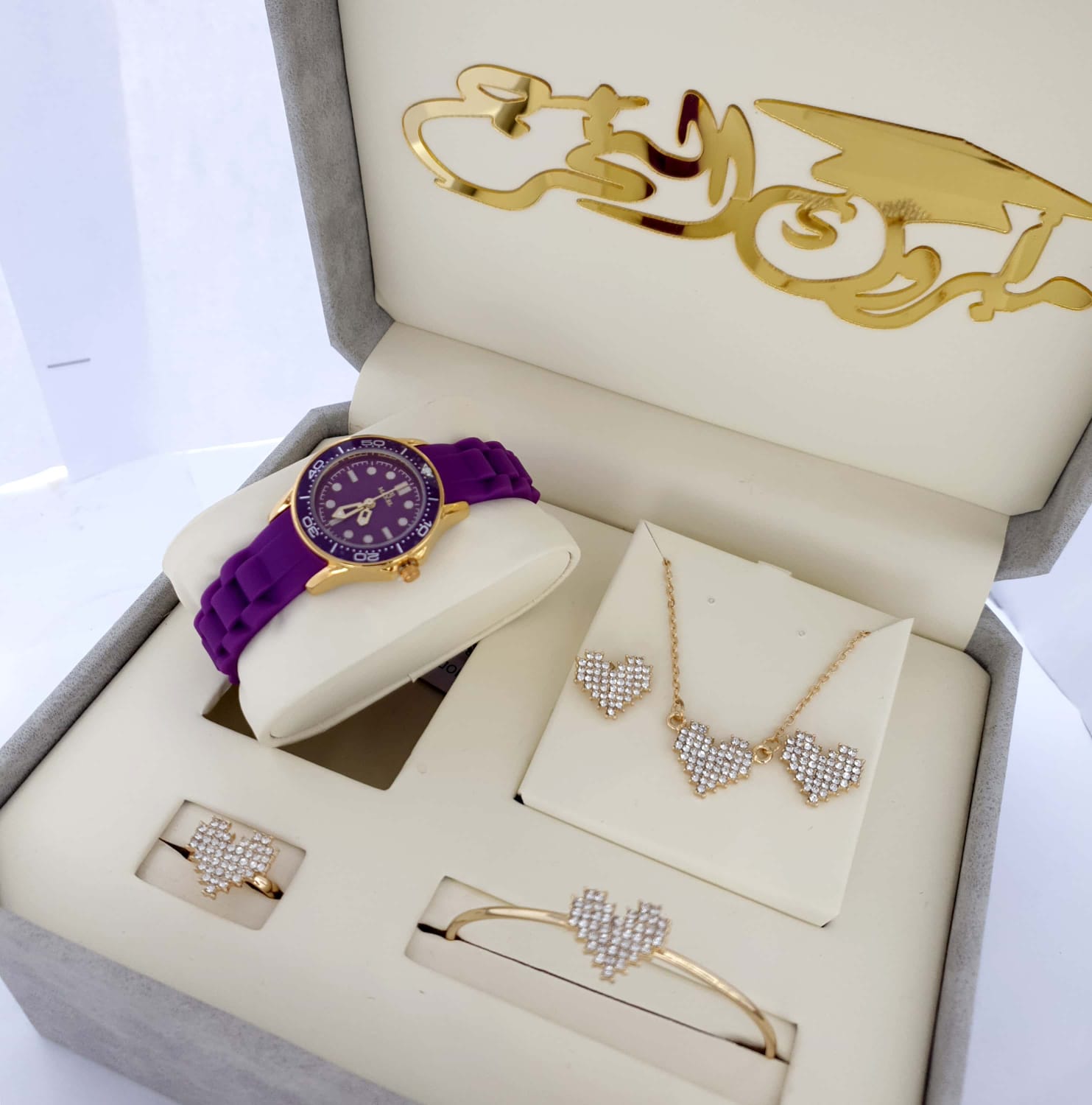 طقم إكسسوارات فاخر (عقد، حلق، خاتم، إسورة) بتصميم ناعم مزين بزهور راقية، يضفي لمسة أنثوية ساحرة.